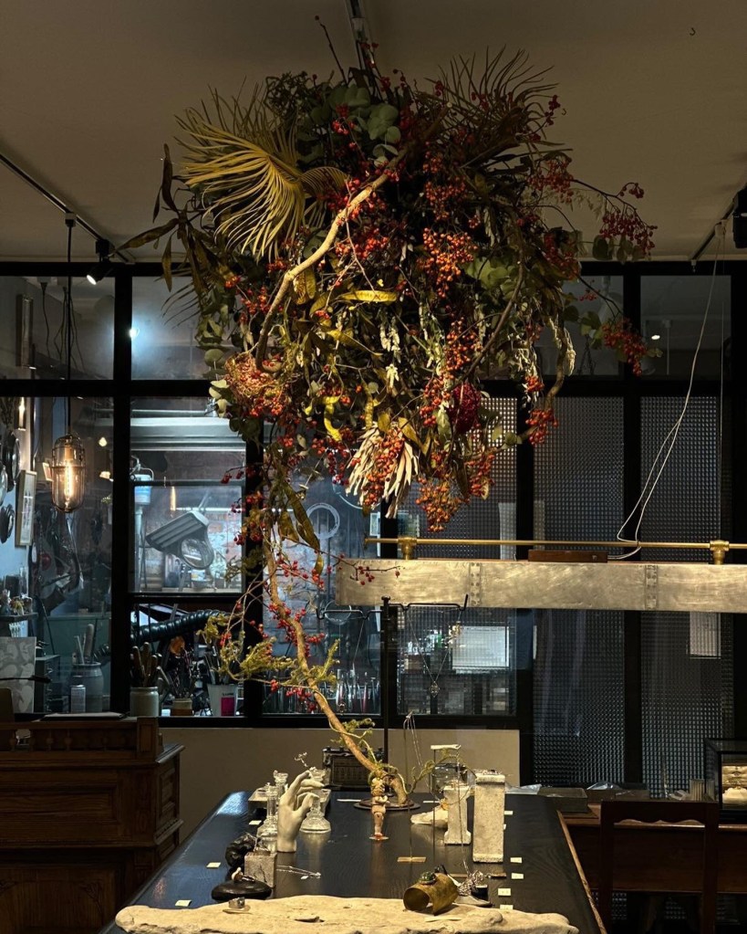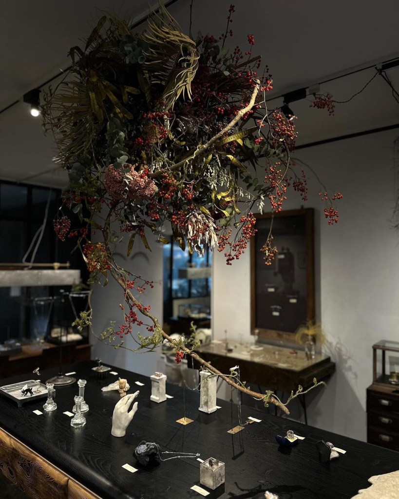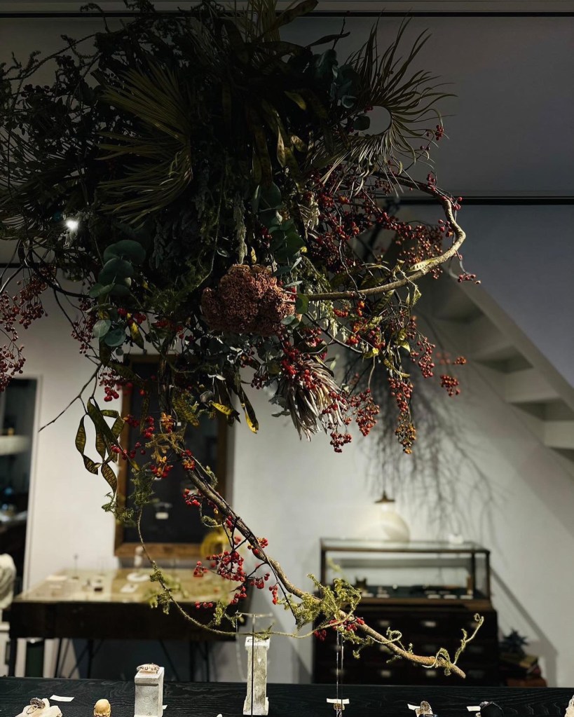 基本的には展示に邪魔にならないように天井に吊るタイプ。クリスマス時期の花材が多いが長く楽しめるように余り季節は意識せず、植物の形に任せてナチュラルに仕上げる。