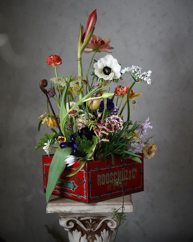 ここから選択する事としてはどの様に生けるか。箱の中に平に生けるBOX的な事も出来るし、缶の倍くらいの高さでモサモサした感じも出来るし。今回の様に1種類1本的なのも。その他花材をある程度まとめて同じトーンで作るなどなど。